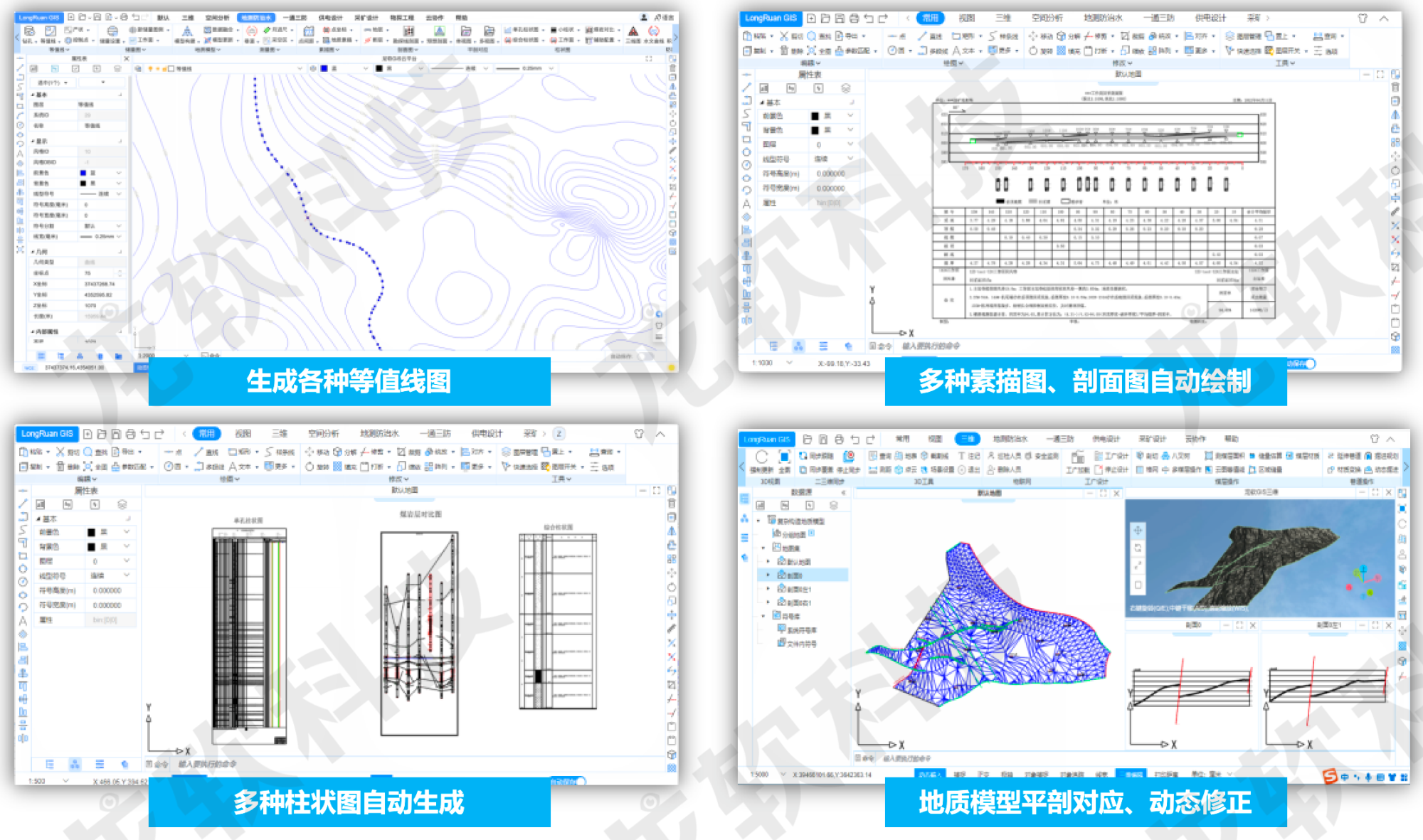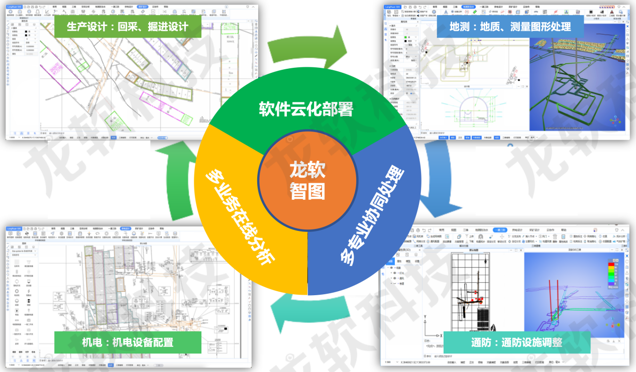 除了專業(yè)機電設(shè)備和環(huán)境監(jiān)測系統(tǒng)的生產(chǎn)外,龍軟科技-北大團(tuán)隊已經(jīng)成為國內(nèi)外煤礦智能化建設(shè)自主產(chǎn)業(yè)鏈較為完整的團(tuán)隊之一,從采掘透明化探測、礦山“采、掘、機、運、通”和“水、火、瓦斯、頂板”多維專題圖形的處理、透明化地測保障系統(tǒng)、基于透明化地測的管控平臺,到智能化綜掘、智能化綜采、智能化通風(fēng)、智能化洗選,都有專門的研發(fā)和實施團(tuán)隊,而且成果眾多。智能化礦山建設(shè)產(chǎn)業(yè)鏈的重要基礎(chǔ)是透明化地測保障系統(tǒng),而透明化地測保障系統(tǒng)的基礎(chǔ)就是能夠處理各類專題圖形的GIS軟件系統(tǒng)。