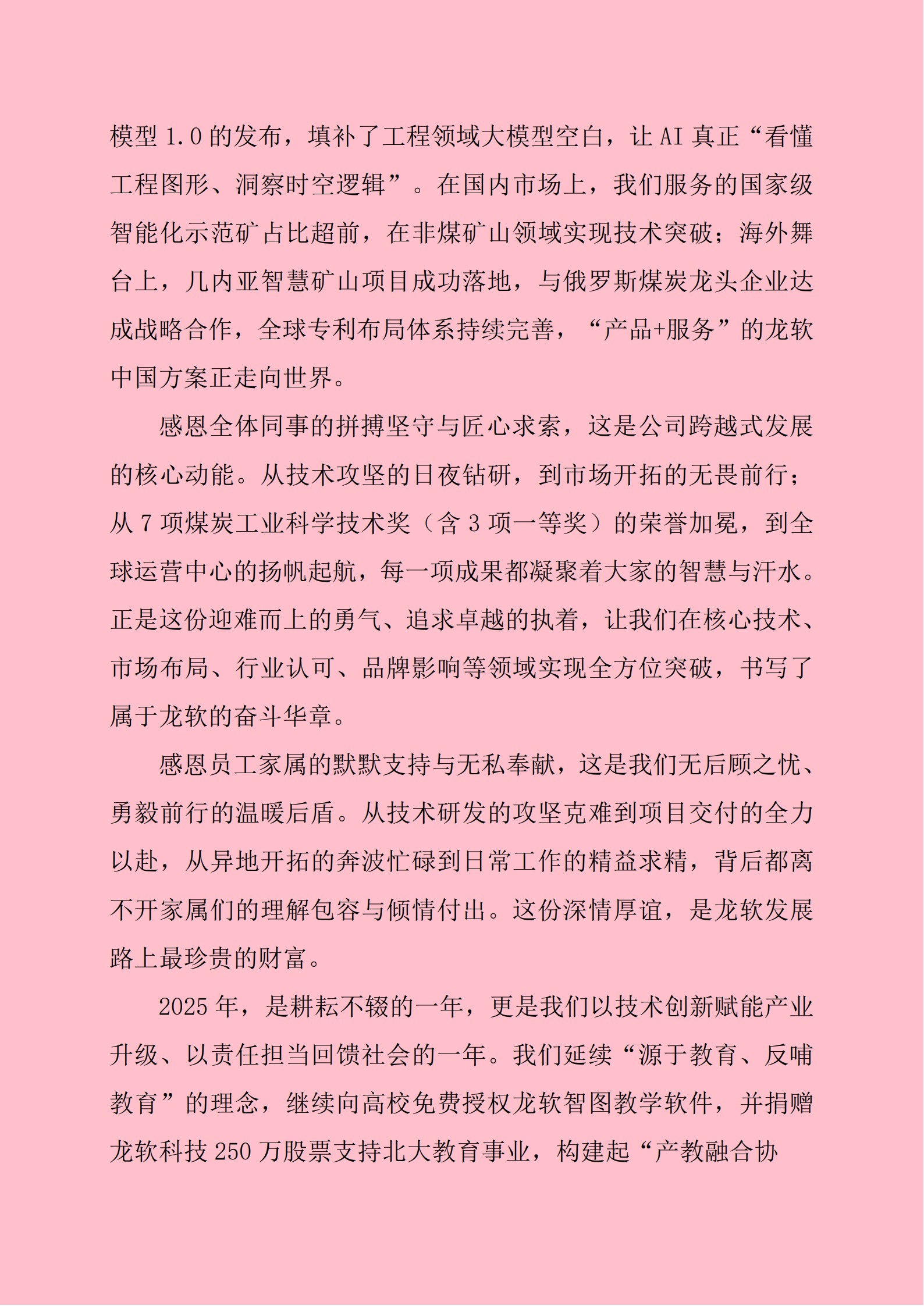 2025年10月,董事長毛善君教授受邀參加第六屆北大能源論壇暨北京大學能源研究院成立五周年學術交流會,作為企業界代表與高校校長、院士專家共話“能源轉型與人才戰略”,結合龍軟科技與北京大學鄂爾多斯能源研究院的合作實踐,提出“技術研發-人才培養-產業應用”三位一體的產教融合模式,建議相關高校圍繞“時空智能、智能采礦”等新領域優化課程體系,企業通過聯合實驗室、實習基地為學生提供實戰平臺。2025年6月初,在中國礦業大學校慶日,公司高管團隊還參與校企合作論壇,與資源與地球科學學院達成實習基地共建協議,為地學領域人才提供實踐保障。同時,公司積極參與承辦中國煤炭學會第三屆煤炭行業科普大會,通過搭建行業科普交流平臺,普及礦山智能技術與安全高效發展理念,助力提升全行業從業人員的專業素養與安全意識。