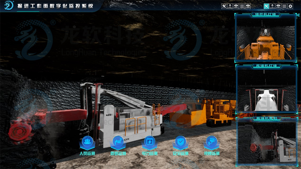 (1)三維可視化平臺的集控功能。具有監測巷道掘進與支護平行作業、監控快速成巷的三維可視化表達功能,現場操作人員在巷道遠端或地面實現遠程操控截割,具備對巷道掘進設備實現一鍵啟停控制。